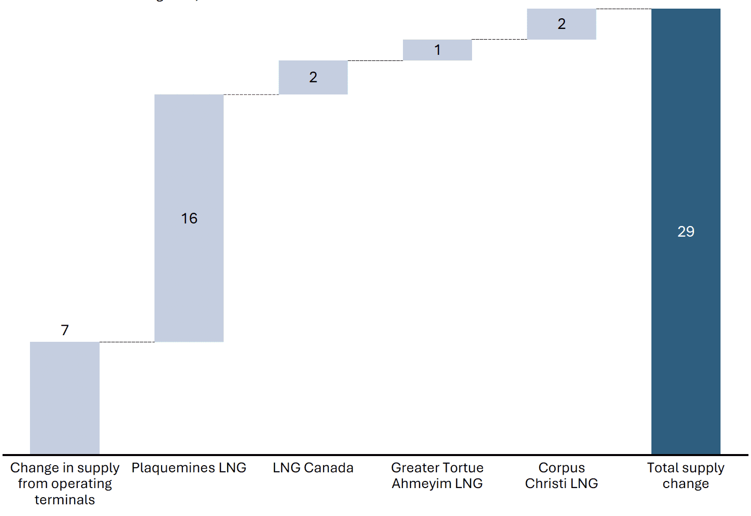 Global LNG supply increased by 29 mtpa, almost entirely due to the ramp up of new North American export projects